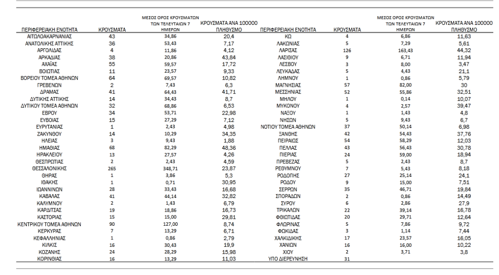 Με βάση τα επιβεβαιωμένα κρούσματα των τελευταίων 7 ημερών, 114 θεωρούνται σχετιζόμενα με ταξίδι από το εξωτερικό και 2.221 είναι σχετιζόμενα με ήδη γνωστό κρούσμα.