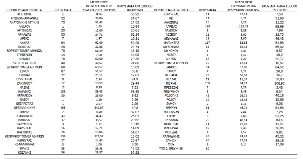 Με βάση τα επιβεβαιωμένα κρούσματα των τελευταίων 7 ημερών, 117 θεωρούνται σχετιζόμενα με ταξίδι από το εξωτερικό και 2.102 είναι σχετιζόμενα με ήδη γνωστό κρούσμα.