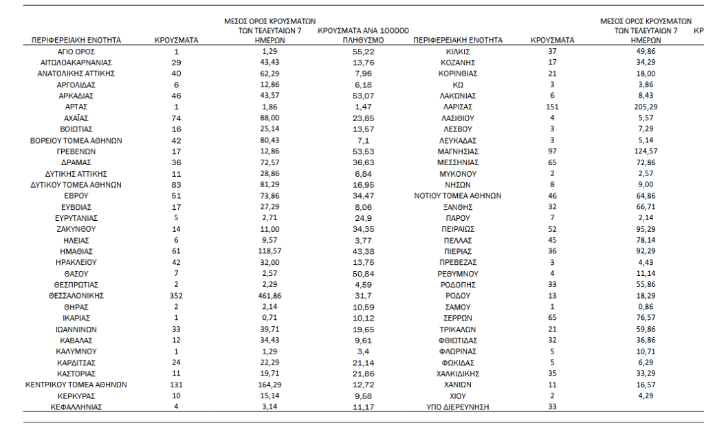 Στην Αργολίδα εντοπίστηκαν 6 νέα κρούσματα, στην Αρκαδία 46, στην Κορινθία 21, στη Λακωνία 6 και στη Μεσσηνία 65