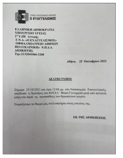 «Σήμερα 25/10/2021 και ώρα 12:04 μμ στο Νοσοκομείο Ευαγγελισμός, απεβίωσε η Πρόεδρος του ΚΙΝΑΛ Φώφη Γεννηματά μετά από πολυετή μάχη και παρά τις προσπάθειες των θεραπόντων ιατρών. Εκφράζουμε τα θερμά μας συλλυπητήρια στους οικείους της»