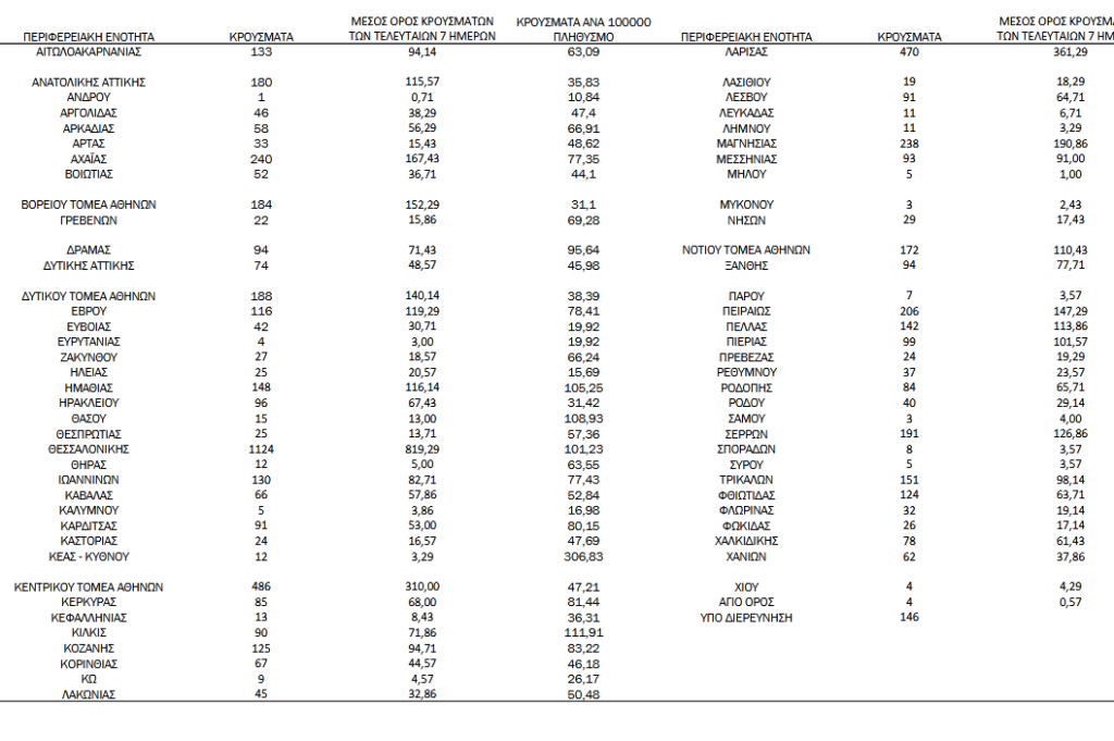 Με βάση τα επιβεβαιωμένα κρούσματα των τελευταίων 7 ημερών, 150 θεωρούνται σχετιζόμενα με ταξίδι από το εξωτερικό και 2.588 είναι σχετιζόμενα με ήδη γνωστό κρούσμα.