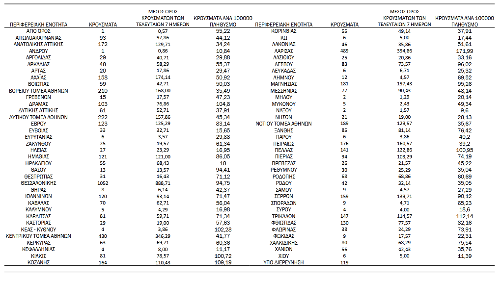 Με βάση τα επιβεβαιωμένα κρούσματα των τελευταίων 7 ημερών, 161 θεωρούνται σχετιζόμενα με ταξίδι από το εξωτερικό και 2.819 είναι σχετιζόμενα με ήδη γνωστό κρούσμα.