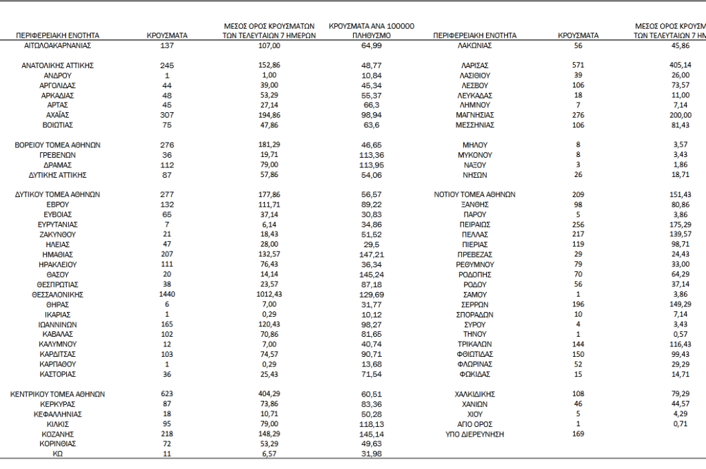Στην Αργολίδα εντοπίστηκαν 44 νέα κρούσματα, στην Αρκαδία 48, στην Κορινθία 72, στη Λακωνία 56 και στη Μεσσηνία 106