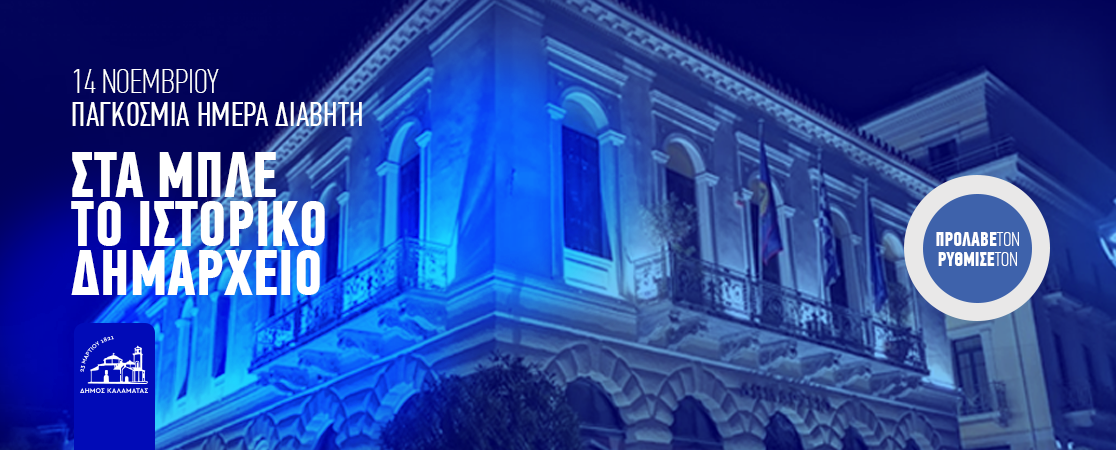 Η Καλαμάτα θα στείλει και φέτος το δικό της μήνυμα. Στο πλαίσιο της 14ης Νοεμβρίου , ο  Σύλλογος Διαβητικών «Γλυκιά Μεσσηνία» σε συνεργασία με το Δήμο Καλαμάτας και υπό την αιγίδα της Πανελλήνιας Ομοσπονδίας Σωματείων – Συλλόγων Ατόμων με Σακχαρώδη Διαβήτη και της Περιφερειακής Ομοσπονδίας ΑμεΑ  Πελοποννήσου θα πραγματοποιήσει εκστρατεία ενημέρωσης  για το Σακχαρώδη Διαβήτη. Συγκεκριμένα, την Κυριακή 14/11/2021 και ώρα 19.00, έμπροσθεν  του ιστορικού  Δημαρχείου (πεζόδρομος Αριστομένους), το οποίο θα φωταγωγηθεί με μπλε χρώμα, θα μιλήσουν για την Παγκόσμια Ημέρα Διαβήτη ο Δήμαρχος Καλαμάτας Θανάσης Βασιλόπουλος, ο Αντιπεριφερειάρχης Μεσσηνίας, ο Πρόεδρος του Ιατρικού Συλλόγου Μεσσηνίας και εξειδικευμένοι στο διαβήτη ιατροί. Ταυτόχρονα στον πεζόδρομο και εν συνεχεία στην κεντρική πλατεία της πόλης, θα διανεμηθεί στους πολίτες ενημερωτικό υλικό.