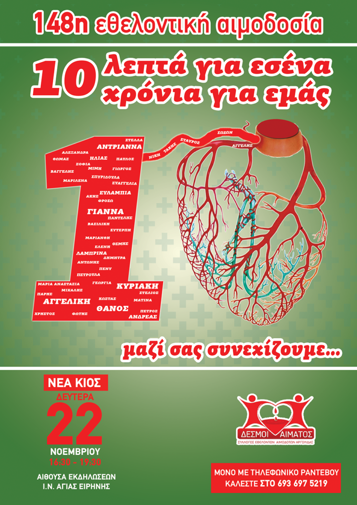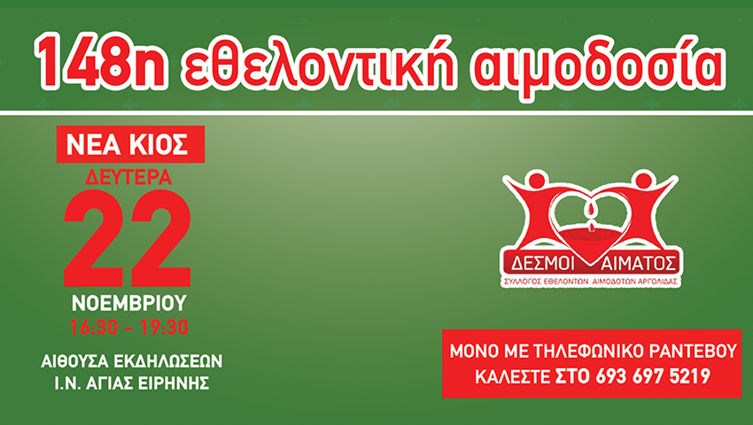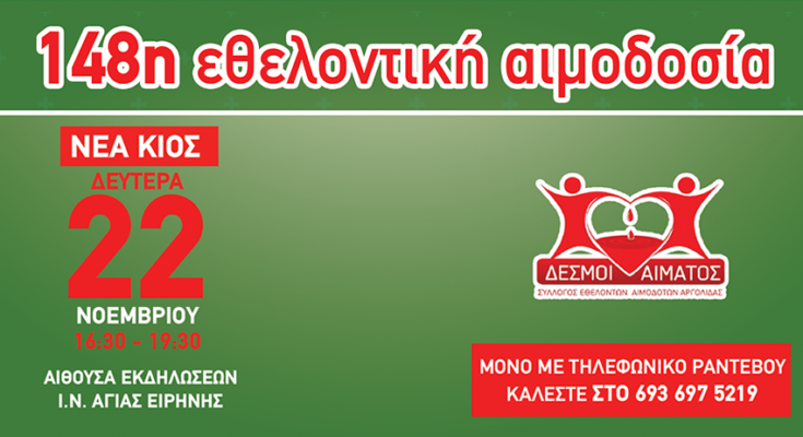 Ο Σύλλογος Εθελοντών Αιμοδοτών Νομού Αργολίδας “Δεσμοί Αίματος” διοργανώνει τη 148η τακτική εθελοντική αιμοδοσία τη Δευτέρα 22 Νοεμβρίου 2021 από 4:30μμ έως 7:30μμ στο χώρο της αίθουσας εκδηλώσεων του Ιερού Ναού Αγίας Ειρήνης στη ΝΕΑ ΚΙΟ.