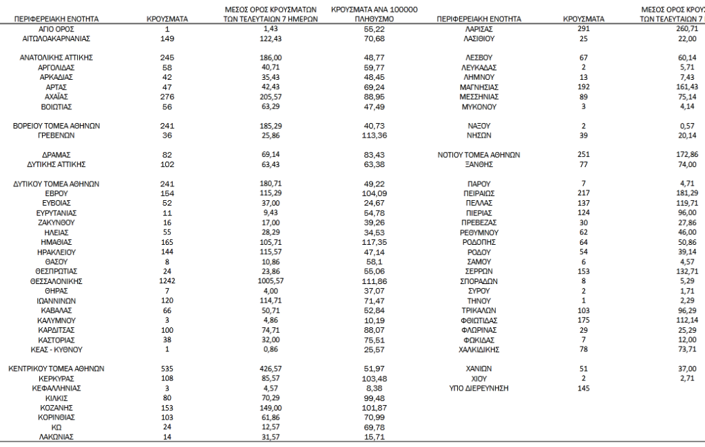 Με βάση τα επιβεβαιωμένα κρούσματα των τελευταίων 7 ημερών, 103 θεωρούνται σχετιζόμενα με ταξίδι από το εξωτερικό και 2.879 είναι σχετιζόμενα με ήδη γνωστό κρούσμα.