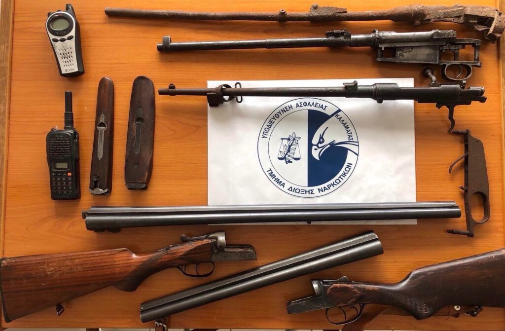 - -2- κυνηγετικά όπλα, -3- κάννες όπλων, -2- ασύρματοι πομποδέκτες, ποσότητες κάνναβης, συνολικού βάρους -54,6- γραμμαρίων, δενδρύλλιο κάνναβης και εργαλείο αφαίρεσης αντικλεπτικού συστήματος, στη Μεσσηνία.