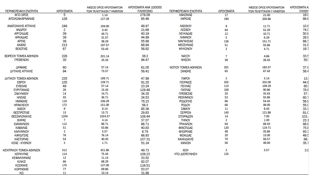 Τα νέα εργαστηριακά επιβεβαιωμένα κρούσματα της νόσου που καταγράφηκαν τις τελευταίες 24 ώρες είναι 6.602 , εκ των οποίων 14 εντοπίστηκαν κατόπιν ελέγχων στις πύλες εισόδου της χώρας. Ο συνολικός αριθμός των κρουσμάτων ανέρχεται σε 914.824 (ημερήσια μεταβολή +0.7%), εκ των οποίων 50.6% άνδρες. Με βάση τα επιβεβαιωμένα κρούσματα των τελευταίων 7 ημερών, 113 θεωρούνται σχετιζόμενα με ταξίδι από το εξωτερικό και 2.674 είναι σχετιζόμενα με ήδη γνωστό κρούσμα.