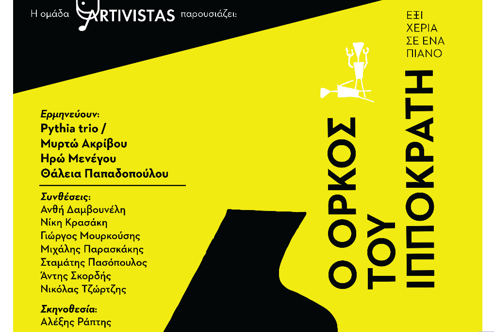 Το Σάββατο 4 Δεκεμβρίου 2021 και ώρα 20:30, στο Αμφιθέατρο Φιλαρμονικής Καλαμάτας θα εμφανιστούν τρεις πιανίστες σ’ ένα πιάνο που ερμηνεύουν εφτά νέες συνθέσεις σε μια πρωτότυπη συναυλία – παράσταση, εμπνευσμένη από το έργο του Mauricio Kagel (1931 – 2008) “Ο Όρκος του Ιπποκράτη” (1984), γραμμένο επίσης για το ίδιο σύνολο.