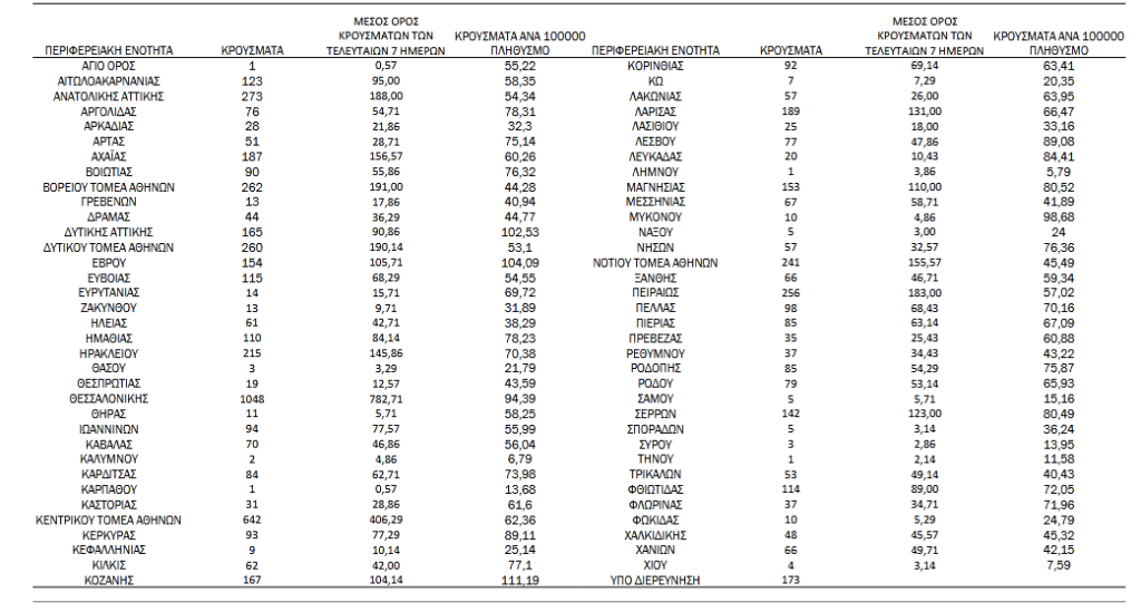 Με βάση τα επιβεβαιωμένα κρούσματα των τελευταίων 7 ημερών, 99 θεωρούνται σχετιζόμενα με ταξίδι από το εξωτερικό και 2.604 είναι σχετιζόμενα με ήδη γνωστό κρούσμα.