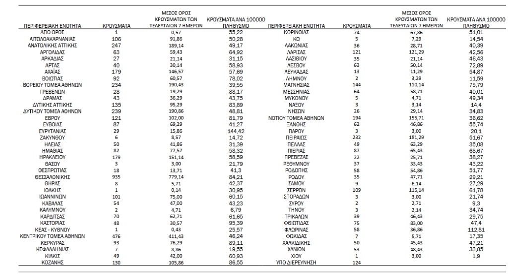 Τα νέα εργαστηριακά επιβεβαιωμένα κρούσματα της νόσου που καταγράφηκαν τις τελευταίες 24 ώρες είναι 5.899, εκ των οποίων 7 εντοπίστηκαν κατόπιν ελέγχων στις πύλες εισόδου της χώρας. Ο συνολικός αριθμός των κρουσμάτων ανέρχεται σε 984.301 (ημερήσια μεταβολή +0.6%), εκ των οποίων 50.5% άνδρες. Με βάση τα επιβεβαιωμένα κρούσματα των τελευταίων 7 ημερών, 96 θεωρούνται σχετιζόμενα με ταξίδι από το εξωτερικό και 2.536 είναι σχετιζόμενα με ήδη γνωστό κρούσμα.
