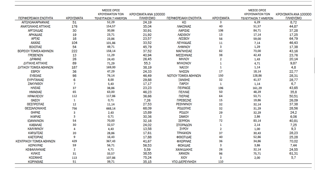 Τα νέα εργαστηριακά επιβεβαιωμένα κρούσματα της νόσου που καταγράφηκαν τις τελευταίες 24 ώρες είναι 4.345, εκ των οποίων 11 εντοπίστηκαν κατόπιν ελέγχων στις πύλες εισόδου της χώρας. Ο συνολικός αριθμός των κρουσμάτων ανέρχεται σε 1.031.239 (ημερήσια μεταβολή +0.4%), εκ των οποίων 50.5% άνδρες. 1 Με βάση τα επιβεβαιωμένα κρούσματα των τελευταίων 7 ημερών, 207 θεωρούνται σχετιζόμενα με ταξίδι από το εξωτερικό και 3.409 είναι σχετιζόμενα με ήδη γνωστό κρούσμα.