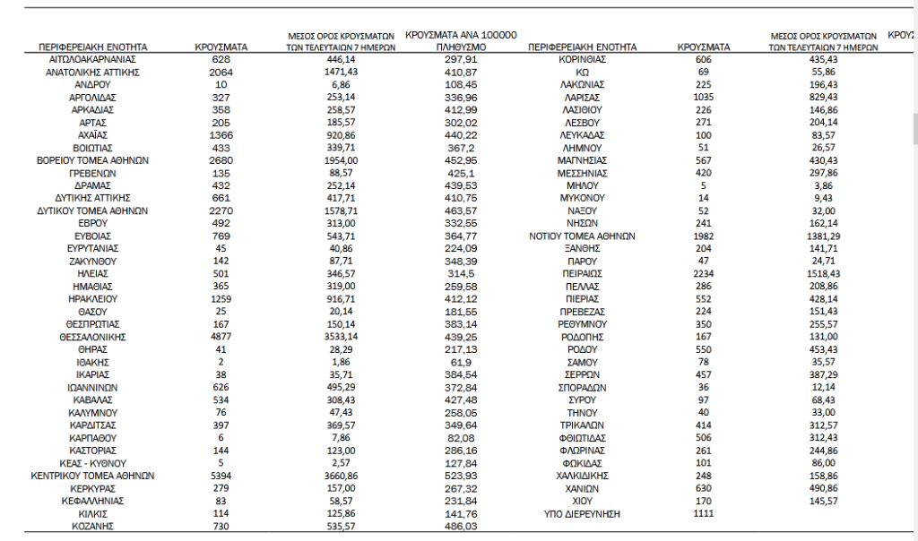 Ο συνολικός αριθμός των κρουσμάτων ανέρχεται σε 1.388.309 (ημερήσια μεταβολή +3.2%), εκ των οποίων 50.1% άνδρες. Με βάση τα επιβεβαιωμένα κρούσματα των τελευταίων 7 ημερών, 326 θεωρούνται σχετιζόμενα με ταξίδι από το εξωτερικό και 1.398 είναι σχετιζόμενα με ήδη γνωστό κρούσμα.