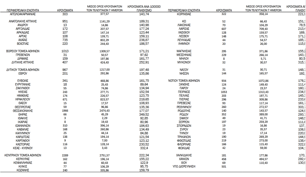 Ο συνολικός αριθμός των κρουσμάτων ανέρχεται σε 1.612.869 (ημερήσια μεταβολή +1.3%), εκ των οποίων 49.9% άνδρες. Με βάση τα επιβεβαιωμένα κρούσματα των τελευταίων 7 ημερών, 621 θεωρούνται σχετιζόμενα με ταξίδι από το εξωτερικό και 2.336 είναι σχετιζόμενα με ήδη γνωστό κρούσμα.