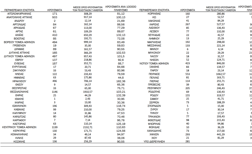 - Ο συνολικός αριθμός των κρουσμάτων ανέρχεται σε 1.660.871 (ημερήσια μεταβολή +0.7%), εκ των οποίων 49.8% άνδρες. Με βάση τα επιβεβαιωμένα κρούσματα των τελευταίων 7 ημερών, 506 θεωρούνται σχετιζόμενα με ταξίδι από το εξωτερικό και 2.146 είναι σχετιζόμενα με ήδη γνωστό κρούσμα.