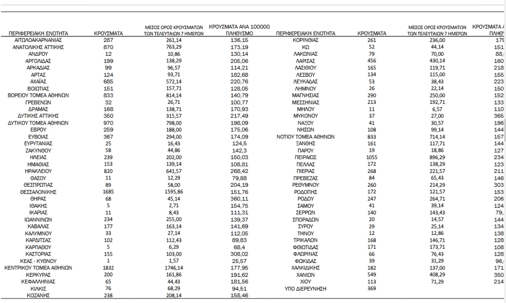 Ο συνολικός αριθμός των κρουσμάτων ανέρχεται σε 1.679.705 (ημερήσια μεταβολή +1.1%), εκ των οποίων 49.8% άνδρες. Με βάση τα επιβεβαιωμένα κρούσματα των τελευταίων 7 ημερών, 473 θεωρούνται σχετιζόμενα με ταξίδι από το εξωτερικό και 2.148 είναι σχετιζόμενα με ήδη γνωστό κρούσμα.