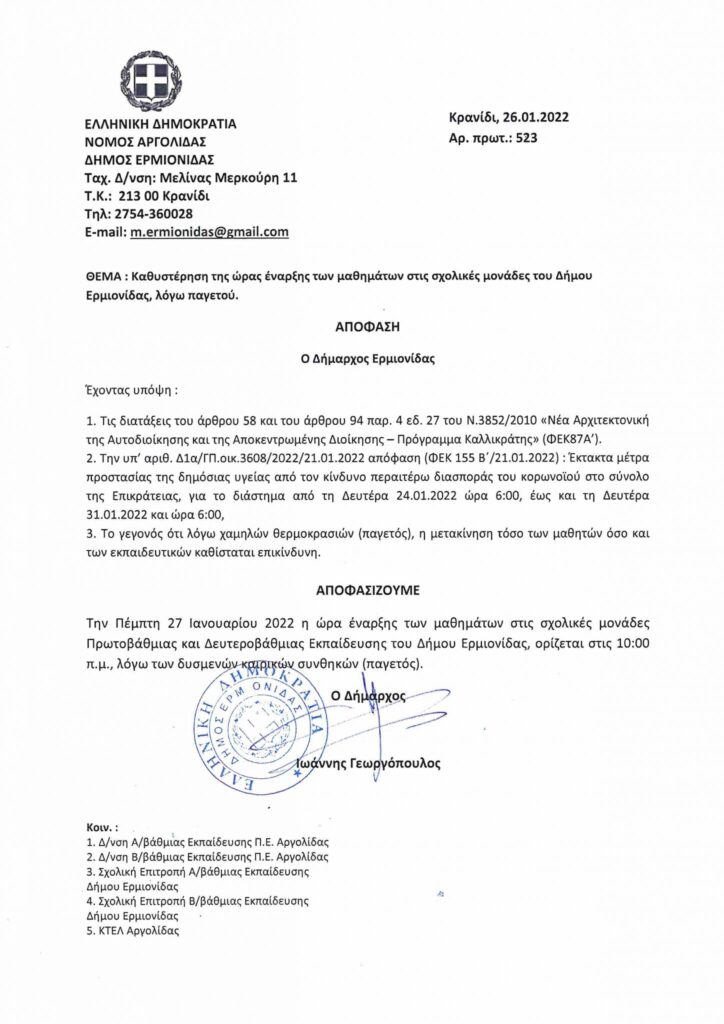 Στις 10:00 η έναρξη των μαθημάτων αύριο Πέμπτη στα Σχολεία της Ερμιονίδας 26/01/202226/01/2022 - by ΕΔΩ ΠΕΛΟΠΟΝΝΗΣΟΣ - Αφήστε ένα σχόλιο