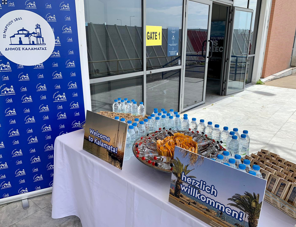 Τους τουρίστες υποδέχθηκαν ο Δήμαρχος Καλαμάτας, Θανάσης Βασιλόπουλος, ο Βουλευτής Μεσσηνίας, Περικλής Μαντάς, η Αντιπεριφερειάρχης Πελοποννήσου για τον Τουρισμό, Άννα Καλογεροπούλου, ο Αντιδήμαρχος Στρατηγικού Σχεδιασμού και Τουρισμού, Νίκος Μπασακίδης και ο Πρόεδρος της Κοινότητας Καλαμάτας, Παναγιώτης Λύρας.