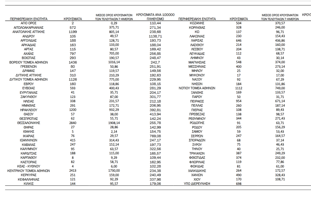 Με βάση τα επιβεβαιωμένα κρούσματα των τελευταίων 7 ημερών, 201 θεωρούνται σχετιζόμενα με ταξίδι από το εξωτερικό και 1.391 είναι σχετιζόμενα με ήδη γνωστό κρούσμα.