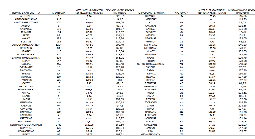 Στην Αργολίδα εντοπίστηκαν 186 νέα κρούσματα, στην Αρκαδία 103, στην Κορινθία 165, στη Λακωνία 144 και στη Μεσσηνία 203