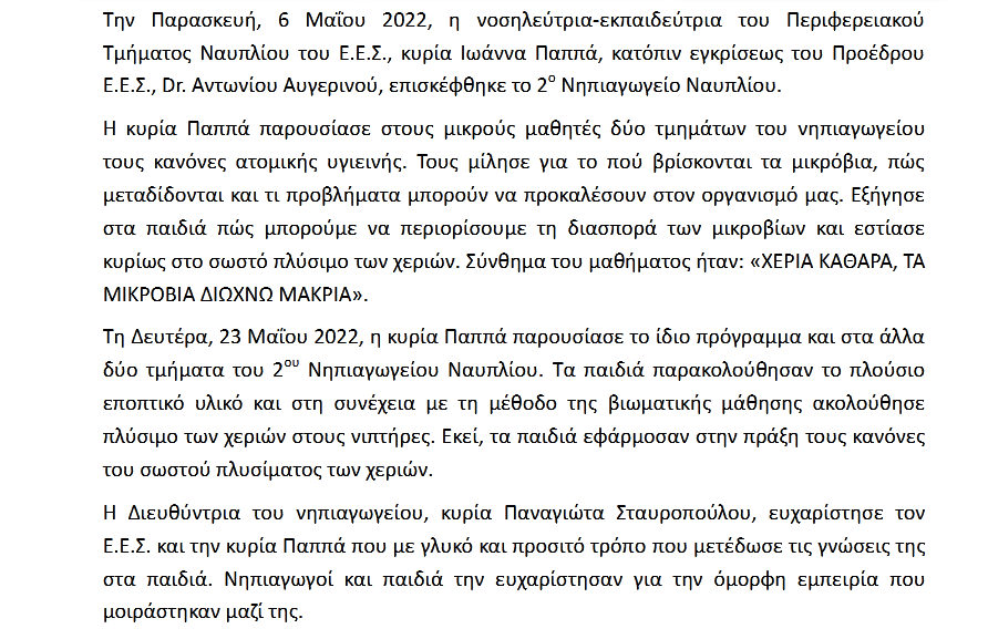 Παρουσίαση κανόνων υγιεινής σε μαθητές νηπιαγωγείου από το Περιφερειακό Τμήμα Ε.Ε.Σ Ναυπλίου 27/05/202227/05/2022 - by ΕΔΩ ΠΕΛΟΠΟΝΝΗΣΟΣ - Αφήστε ένα σχόλιο