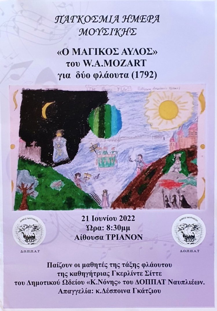 Ο Δήμος Ναυπλιέων και ο Δ.Ο.Π.Π.Α.Τ. , σήμερα Τρίτη 21 Ιουνίου γιορτάζει την Παγκόσμια ημέρα μουσικής μαζί με το Δημοτικό Ωδείο «Κωνσταντίνος Νόνης» και  θα παρουσιάσει την όπερα «Μαγικός Αυλός» του W.A. Mozart για 2 φλάουτα.