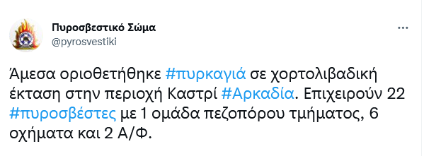 Άμεση κινητοποίηση για πυρκαγιά στο Καστρί 19/08/202219/08/2022 - by ΕΔΩ ΠΕΛΟΠΟΝΝΗΣΟΣ - Αφήστε ένα σχόλιο Οριοθετήθηκε η πυρκαγιά που εκδηλώθηκε σήμερα Παρασκευή 19 Αυγούστου το πρωί σε έκταση κοντά στο Καστρί Αρκαδίας. Σύμφωνα με ενημέρωση από το Πυροσβεστικό Σώμα: φωτο αρχείου