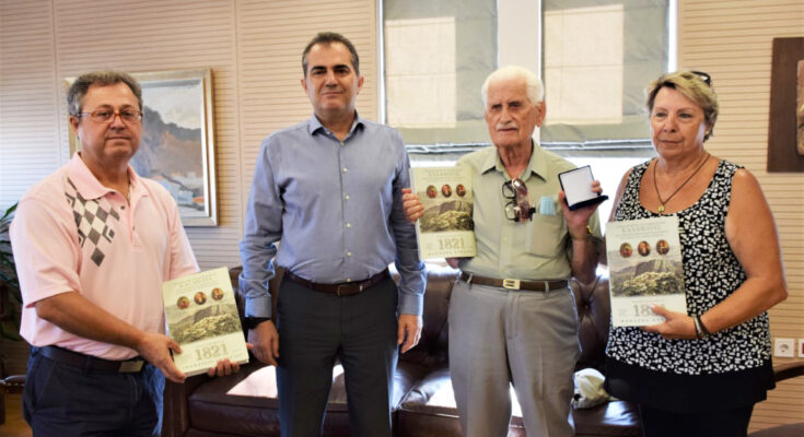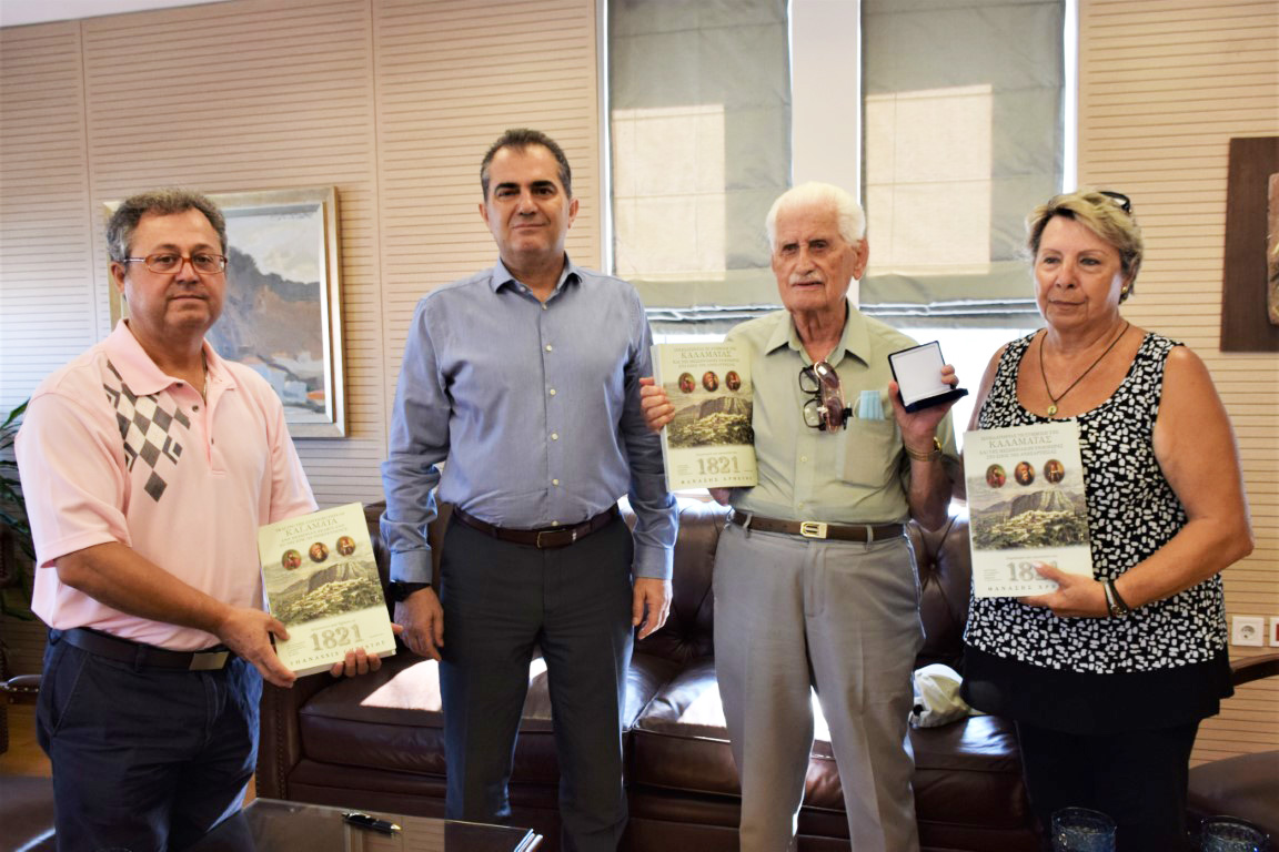 Ιδιαίτερη χαρά εξέφρασαν τη στιγμή που ο Δήμαρχος Καλαμάτας προσέφερε στον κ. Κοκκαλιάρη το αναμνηστικό μετάλλιο της πόλης για τα 200 χρόνια από την Επανάσταση του ’21 και σε όλους τους επισκέπτες το βιβλίο του Δήμου για το ’21.