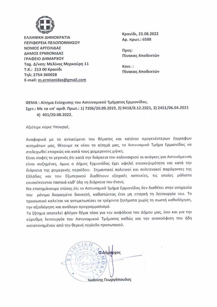 Ο Δήμαρχος Ερμιονίδας, κ. Ιωάννης Γεωργόπουλος, με επιστολή του αιτήθηκε την ενίσχυση του Αστυνομικού Τμήματος Ερμιονίδας με μόνιμο προσωπικό καθ’ όλη την διάρκεια του έτους. Ο βουλευτής του ΠΑΣΟΚ – ΚΙΝ.ΑΛ Αργολίδας, κ. Ανδρέας Πουλάς, ανταποκρίθηκε άμεσα στο αίτημα του Δημάρχου Ερμιονίδας με αναφορά του προς τον Υπουργό Πρστασίας του Πολίτη, κ. Παναγιώτη Θεοδωρικάκο.