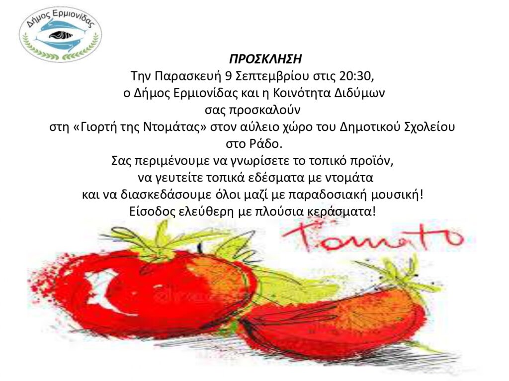 Ερμιονίδα: “Γιορτή Ντομάτας” στο Ράδο της Κοινότητας Διδύμων 07/09/202207/09/2022 - by ΕΔΩ ΠΕΛΟΠΟΝΝΗΣΟΣ - Αφήστε ένα σχόλιο