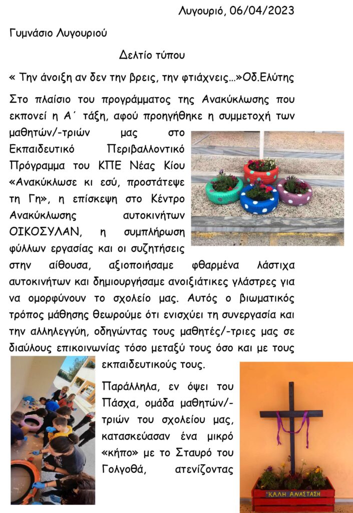 Δράσεις μαθητών του Γυμνασίου Λυγουριού 06/04/202306/04/2023 - by ΕΔΩ ΠΕΛΟΠΟΝΝΗΣΟΣ - Αφήστε ένα σχόλιο