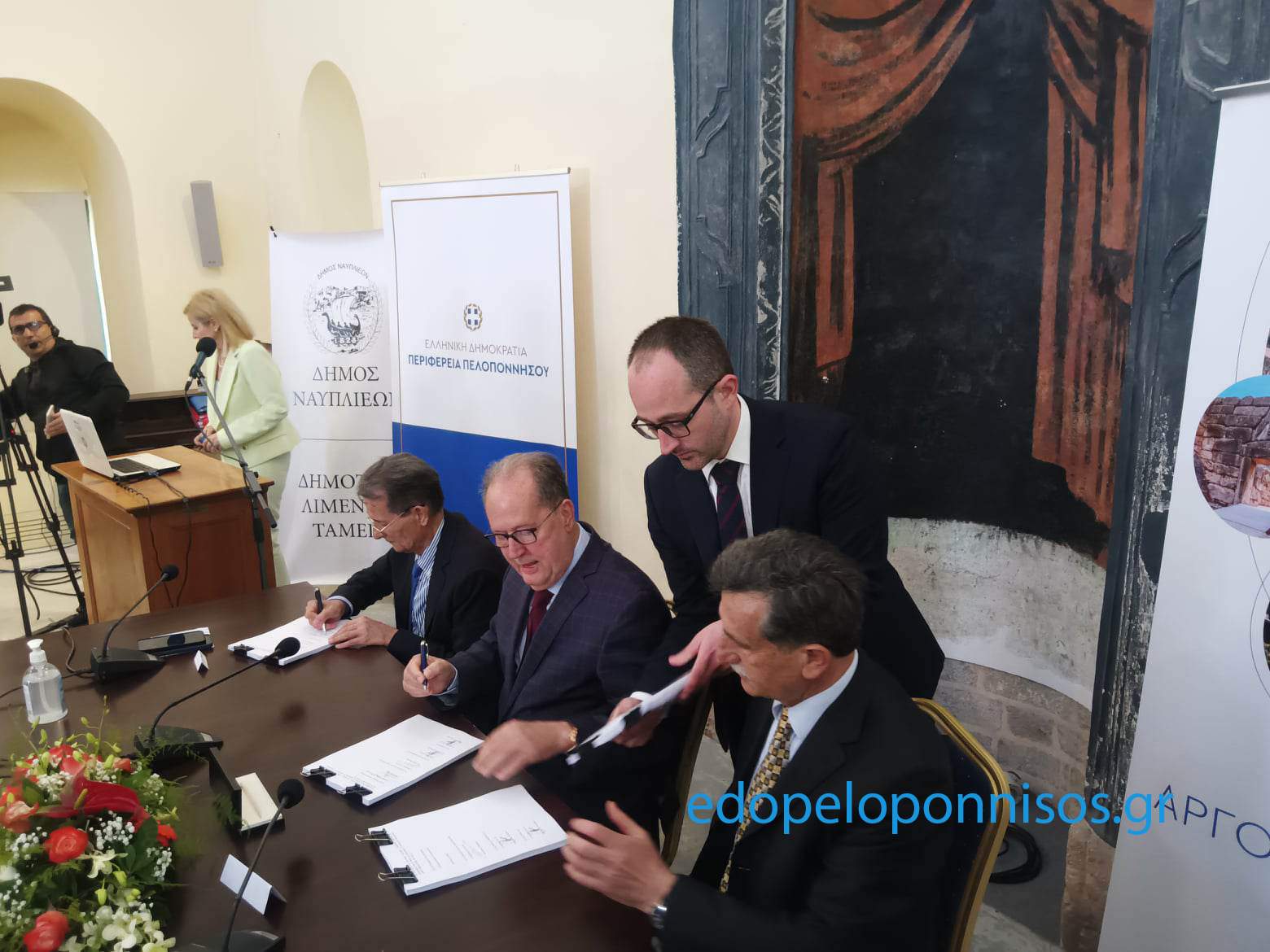 Η ΣΔΙΤ -η πρώτη στην Ελλάδα που αφορά σε μαρίνα- υπογράφηκε παρουσία του υπουργού Τουρισμού Βασίλη Κικίλια, μεταξύ της Περιφέρειας Πελοποννήσου, του Δημοτικού Λιμενικού Ταμείου Ναυπλίου και του παραχωρησιούχου, από τον περιφερειάρχη Π. Νίκα, τον πρόεδρο του Δημοτικού Λιμενικού Ταμείου Ναυπλίου Τάσο Ζαφείρη και τον πρόεδρο και διευθύνοντα σύμβουλο του παραχωρησιούχου, της ΤΕΚΑΛ Α.Ε., Παναγιώτη Ψαλτάκο.