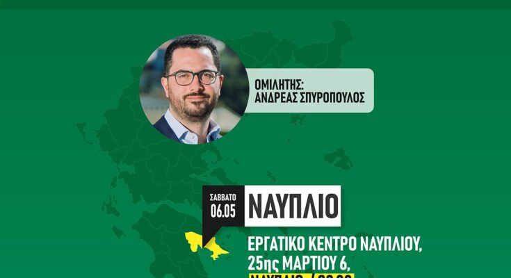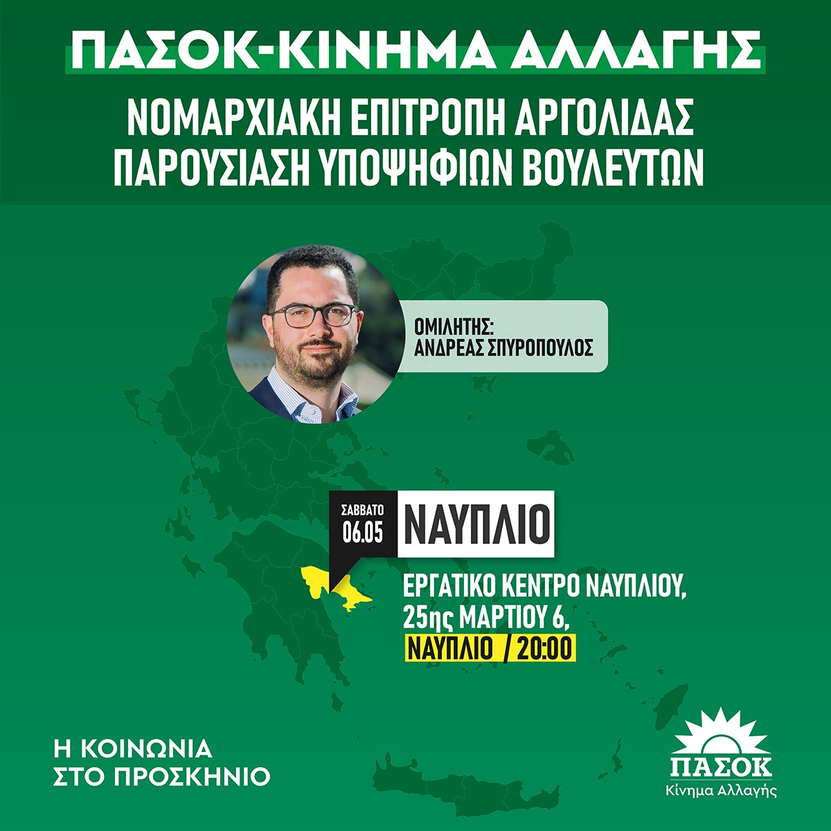 Το Σάββατο, 06-05-2023 στο Εργατικό Κέντρο Ναυπλίου και ώρα 20.00 θα διεξαχθεί πολιτική εκδήλωση με παρουσίαση των υποψήφιων Βουλευτών με κεντρικό ομιλητή και καλεσμένο μας τον Γραμματέα του κόμματος, Ανδρέα Σπυρόπουλο.