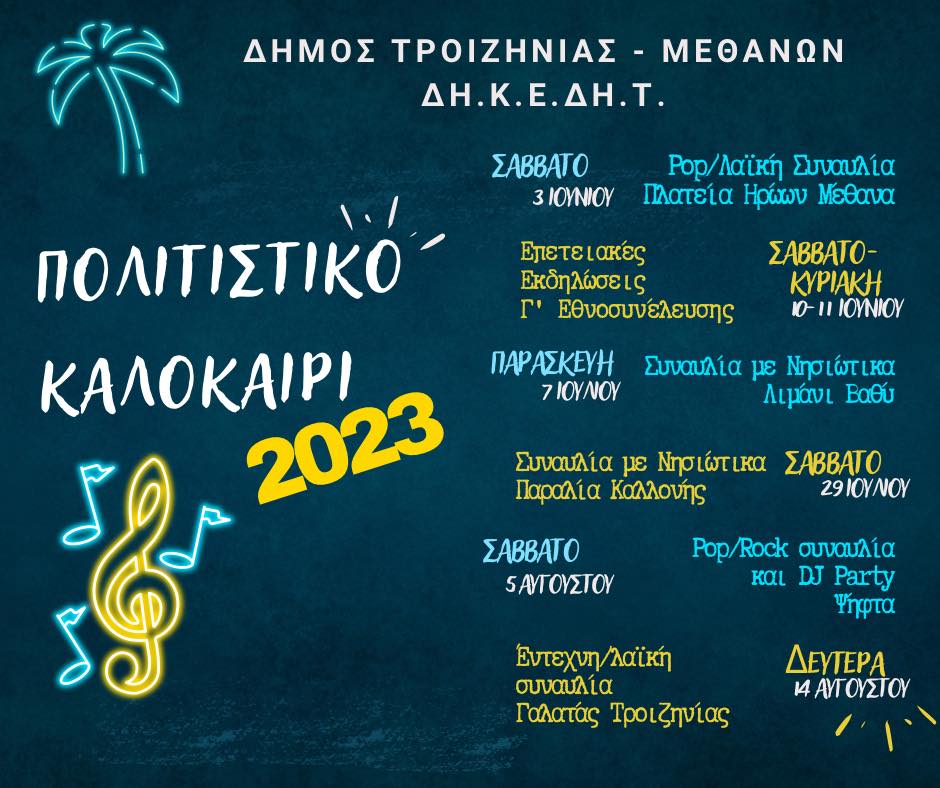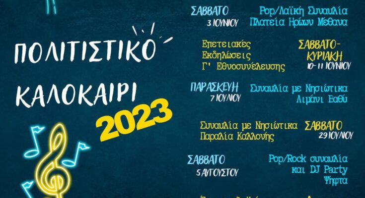 Μετά από 3 χρόνια περιορισμών, λόγω της πανδημίας του covid-19, το φετινό καλοκαίρι ήρθε η ώρα να διασκεδάσουμε, να χορέψουμε και να τραγουδήσουμε όλοι μαζί ενωμένοι! Οι εκδηλώσεις του Πολιτιστικού Καλοκαιριού 2023 εγκαινιάζονται με μεγάλη συναυλία στα Μέθανα το Σάββατο 3/6! Σας περιμένουμε όλους!