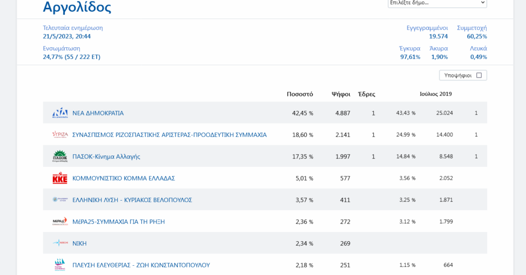 Αποτελέσματα από το 1/4 των τμημάτων στην Αργολίδα 21/05/202321/05/2023 - by ΕΔΩ ΠΕΛΟΠΟΝΝΗΣΟΣ - Αφήστε ένα σχόλιο Σε ενσωμάτωση του 24,77% των τμημάτων στην Αργολίδα ΝΔ 42,45%, ΣΥΡΙΖΑ 18,60%, ΠΑΣΟΚ 17,35%