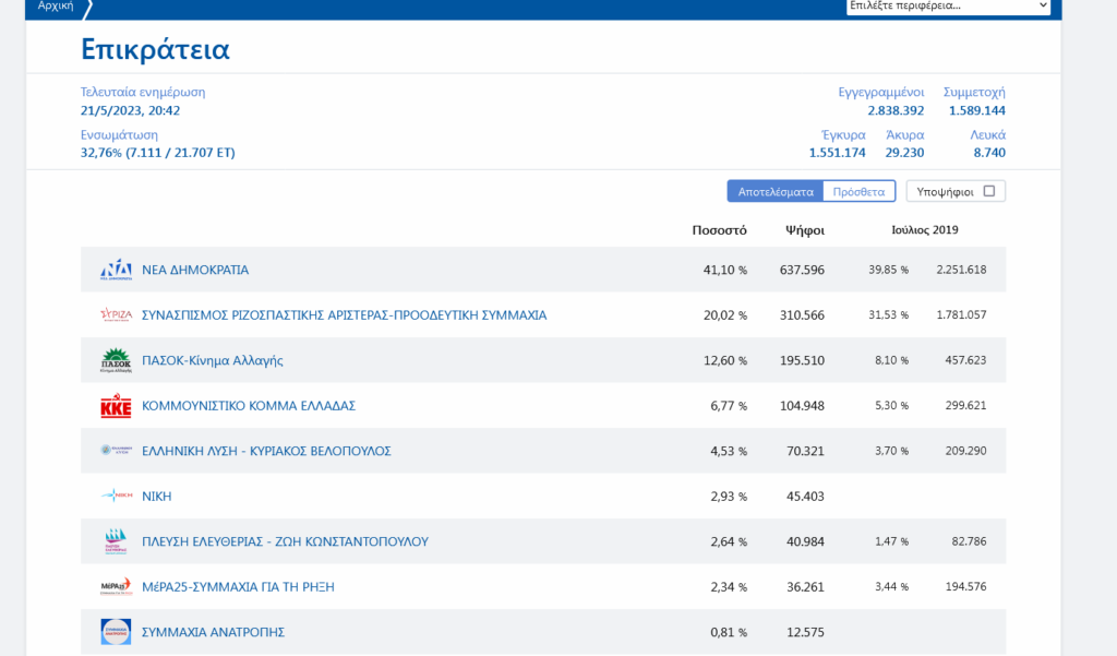 Αποτελέσματα από το 32% της Επικράτειας – Μεγάλη νίκη της ΝΔ – Κατάρρευση ΣΥΡΙΖΑ 21/05/202321/05/2023 - by ΕΔΩ ΠΕΛΟΠΟΝΝΗΣΟΣ - Αφήστε ένα σχόλιο Στο 32,76% της ενσωμάτωσης στην Επικράτεια η ΝΔ 41,10%, ο ΣΥΡΙΖΑ-ΠΣ 20,02%, ΠΑΣΟΚ 12,60%, ΚΚΕ 6,77%, ΕΛ.ΛΥΣΗ 4,53%