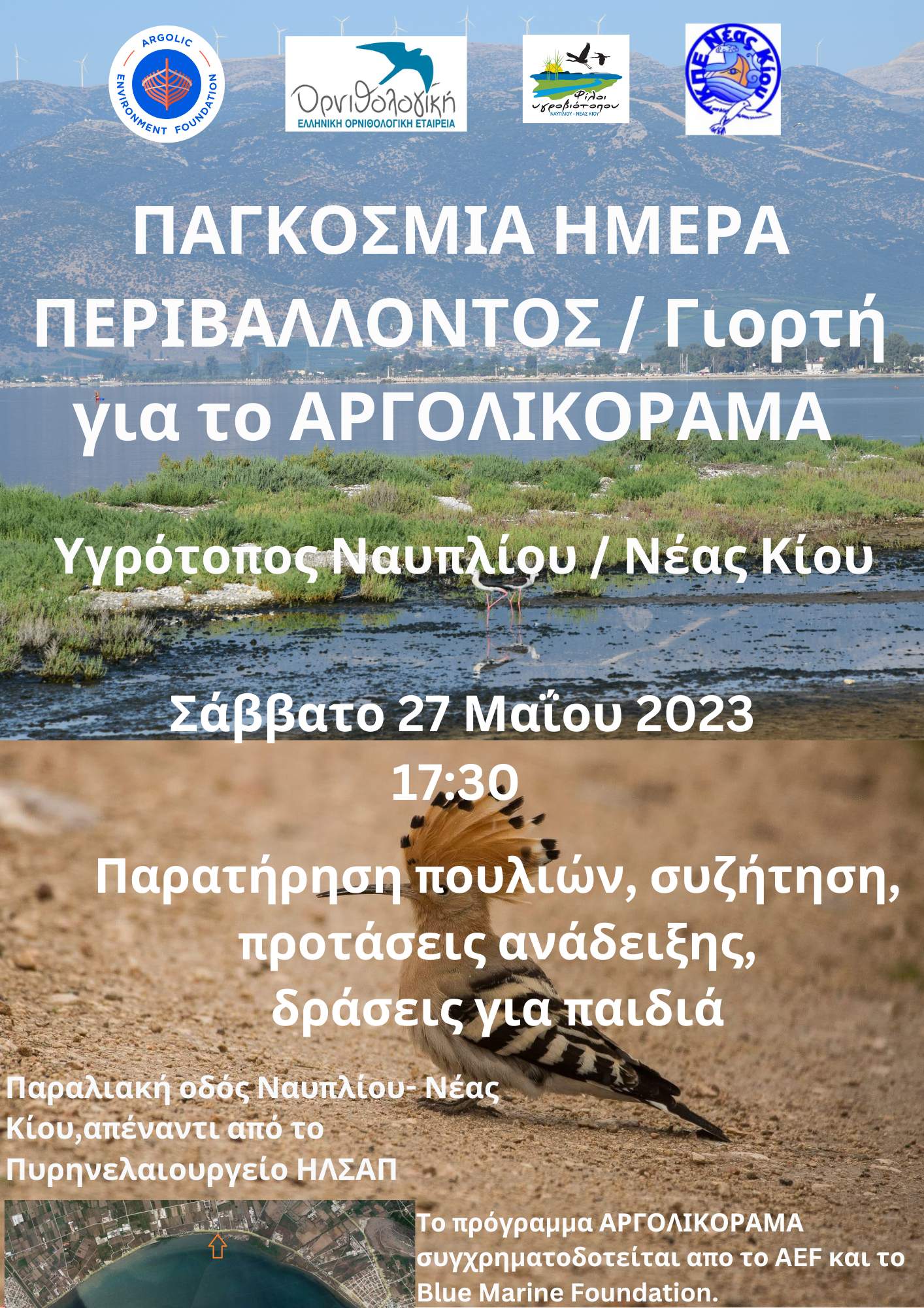 Μια όμορφη και εποικοδομητική συνεργασία φορέων και συλλόγων θα δώσει το παρών στο φετινό εορτασμό της Ημέρας Περιβάλλοντος, με μια εκδήλωση- γιορτή, το Σάββατο 27 Μαΐου 2023, στις 5:30 το απόγευμα, στον Υγρότοπο Ναυπλίου-Νέας Κίου, απέναντι από το πυρηνελαιουργείο ΗΛΣΑΠ.