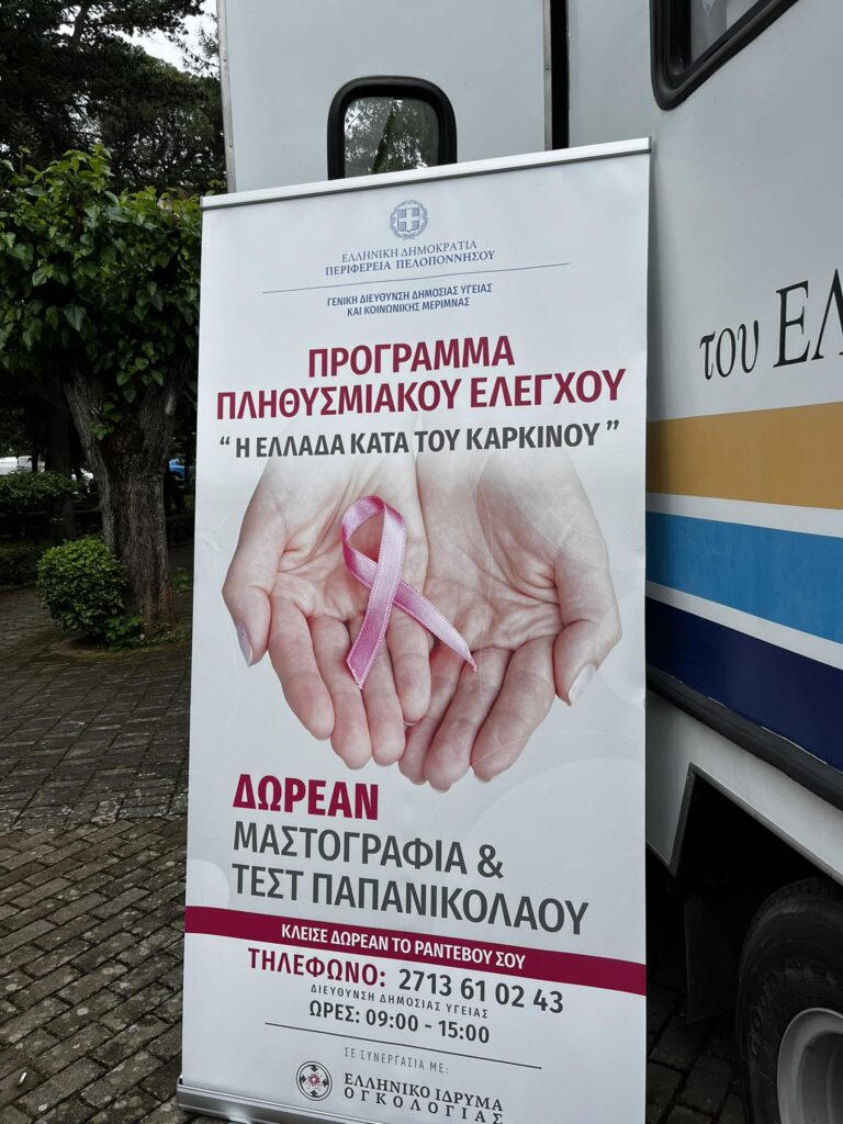 Το Ελληνικό Ίδρυμα Ογκολογίας στο πλαίσιο του προγράμματος πληθυσμιακού ελέγχου «Η Ελλάδα κατά του καρκίνου», για την πρόληψη και έγκαιρη διάγνωση του καρκίνου του μαστού και του τραχήλου της μήτρας, «τρέχει» πρόγραμμα πληθυσμιακού ελέγχου για τις γυναίκες που κατοικούν μόνιμα στο Δήμο Τρίπολης με Μαστογραφία και Τεστ Παπανικολάου.