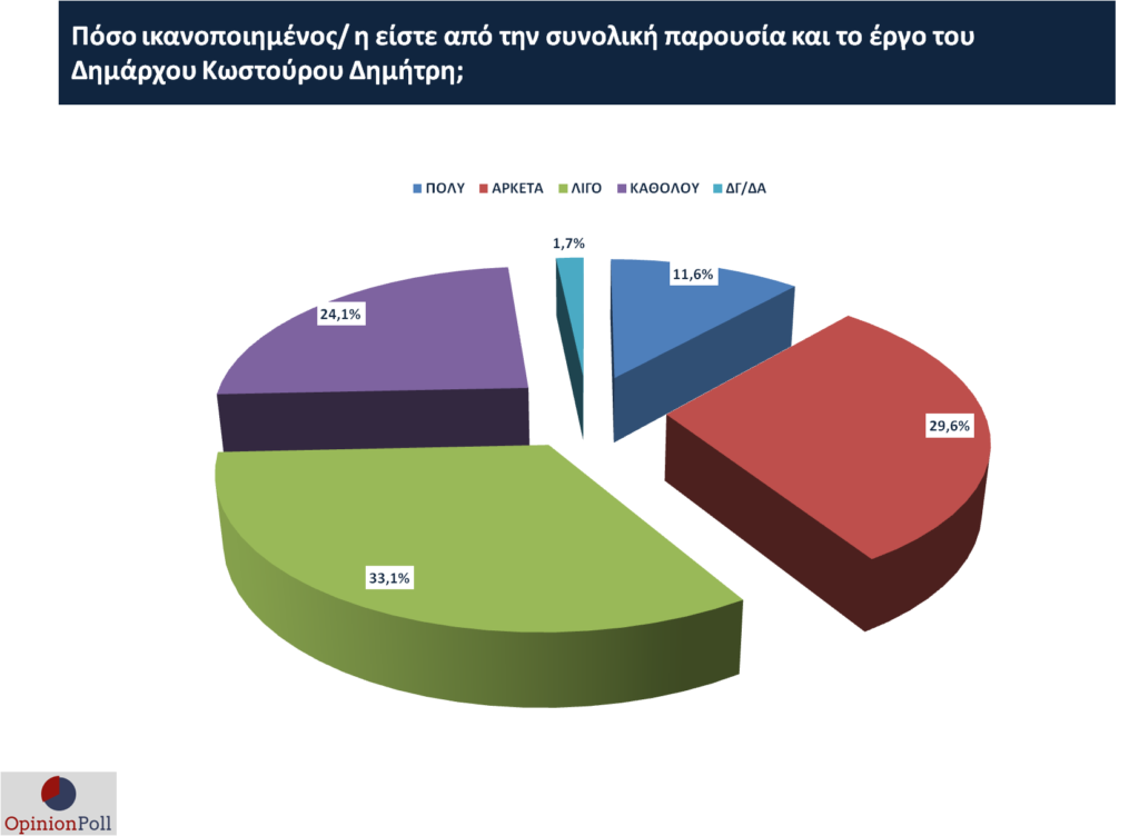 Οι Δημότες σε ποσοστό 41,2% δηλώνουν ικανοποιημένοι από τη συνολική παρουσία και έργο του Δημάρχου Δημήτρη Κωστούρου.