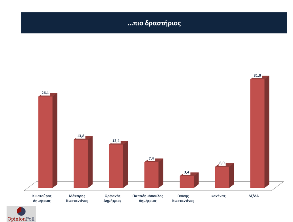 Οι πολίτες του Δήμου Ναυπλιέων σε ποσοστό 26,1% θεωρούν ότι ο Δημήτρης Κωστούρος είναι πιο δραστήριος. Ακολουθεί ο κ. Μάκαρης με ποσοστό 13,8 , ο κ. Ορφανός με ποσοστό 12,4% και ο κ. Παπαδημόπουλος με ποσοστό 7,4%.