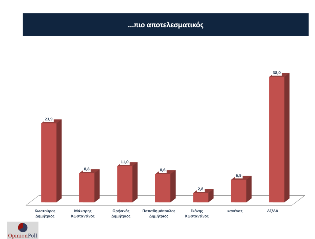 23,9% των δημοτών υποστηρίζουν πως ο νυν Δήμαρχος Δημήτρης Κωστούρος είναι πιο αποτελεσματικός.