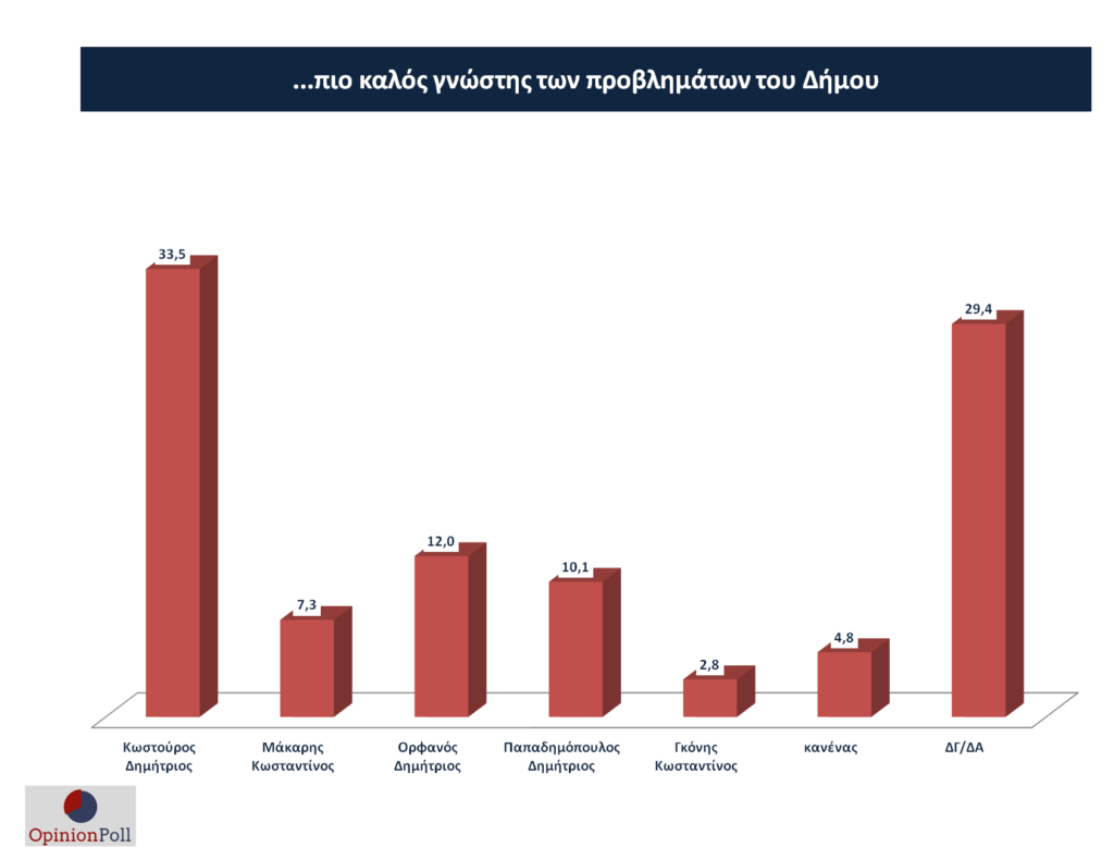Τέλος στην ερώτηση ποιος πιστεύουν ότι γνωρίζει καλύτερα τα προβλήματα του Δήμου ο Δημήτρης Κωστούρος κυριαρχεί με ποσοστό 33,5% και ακολουθούν ο κ. Ορφανός με ποσοστό 12% , ο κ. Παπαδημόπουλος με ποσοστό 10,1% και ο κ. Μάκαρης με ποσοστό 7,3%.