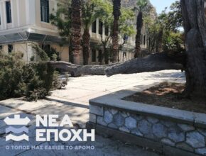 Το σπάσιμο από τη βάση και η πτώση της 12μετρης σαπισμένης βαριάς κλάρας του μεγάλου Πεύκου στην Πλατεία Δικαστηρίων του …