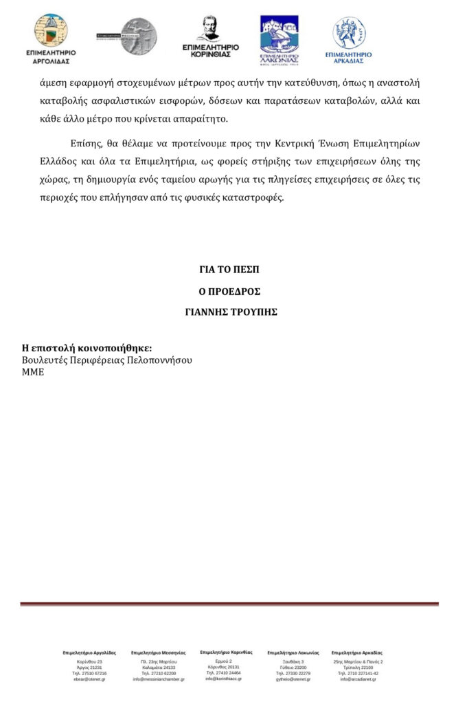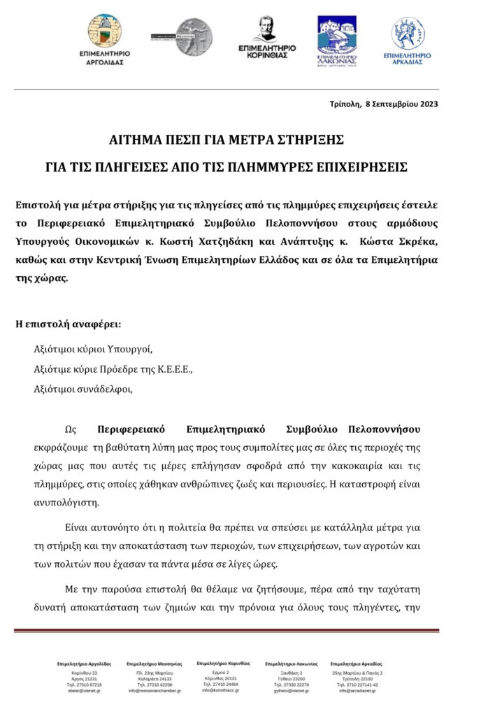 Αίτημα των Επιμελητηρίων Πελοποννήσου για μέτρα στήριξης για τις πληγείσες περιοχές 08/09/202308/09/2023 - by ΕΔΩ ΠΕΛΟΠΟΝΝΗΣΟΣ - Αφήστε ένα σχόλιο