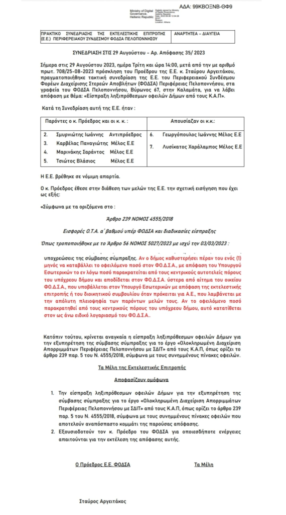 Δηλαδή, στην ουσία η ΤΕΡΝΑ, μέσω του ΦΟΔΣΑ μας κάνει ΚΑΤΑΣΧΕΣΗ για να πληρωθούν τα οφειλόμενα μέχρι τον Απρίλιο, ενώ από δω και πέρα, τα χρέη θα παρακρατούνται από τους ΚΑΠ που δικαιούται ο Δήμος μας (σύμφωνα με το Άρθρο 56 ΝΟΜΟΣ 5027/2023 με ισχύ την 03/03/2023), προκαλώντας έτσι οικονομική ασφυξία, ακόμα και προβλήματα στη λειτουργία του, πόσο μάλλον για την εκτέλεση οποιουδήποτε έργου.