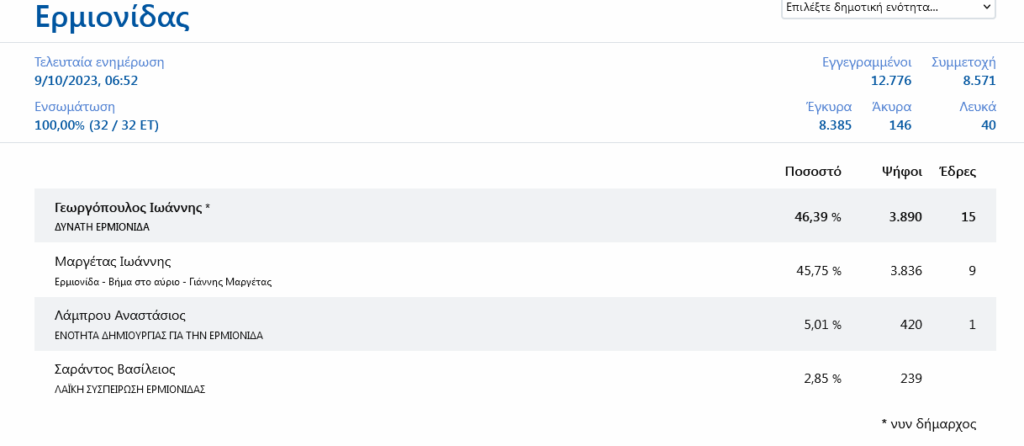 Δήμαρχος Ερμιονίδας ξανά ο Γιάννης Γεωργόπουλος – Μετά από εκλογικό “θρίλερ” επικράτησε του Γιάννη Μαργέτα 09/10/202309/10/2023 - by ΕΔΩ ΠΕΛΟΠΟΝΝΗΣΟΣ - Αφήστε ένα σχόλιο Με πολύ μικρή διαφορά (54 ψήφοι) επικράτησε τελικά τα ξημερώματα ο νυν δήμαρχος Ερμιονίδας Γιάννης Γεωργόπουλος του Γιάννη Μαργέτα
