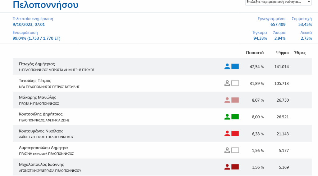 Παρά το μεγάλο του προβάδισμα (42,54%) δεν κατάφερε να εκλεγεί από την πρώτη Κυριακή Περιφερειάρχης Πελοποννήσου ο Δημήτρης Πτωχός. Στο δεύτερο γύρο θα αντιμετωπίσει τον Πέτρο Τατούλη (31,89%) στο 99% της ενσωμάτωσης.