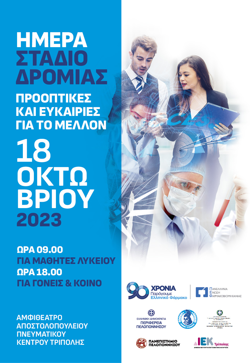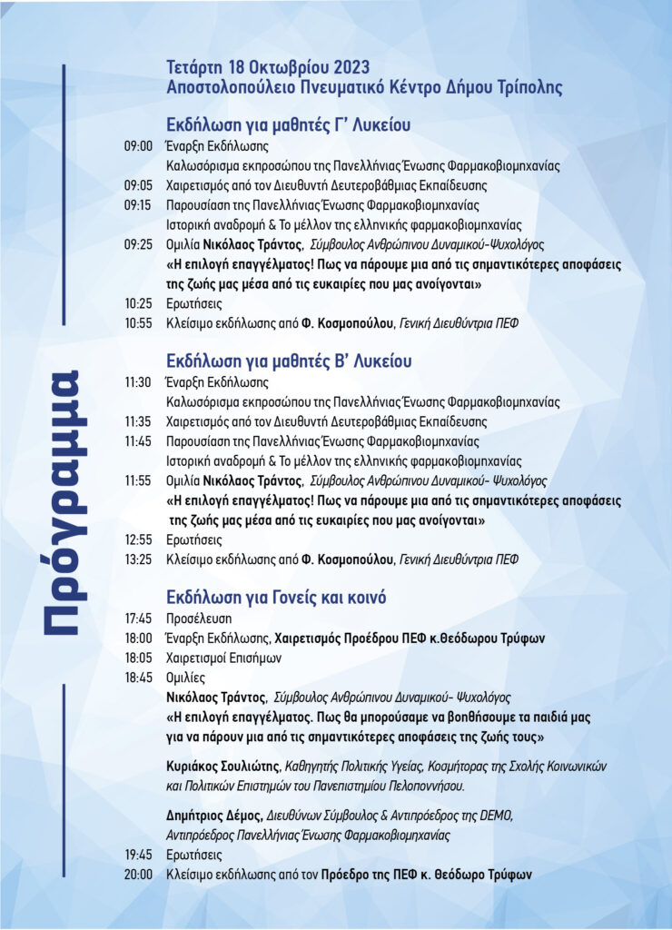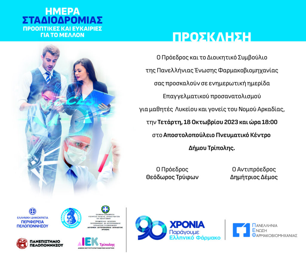 Η Πανελλήνια Ένωση Φαρμακοβιομηχανίας διοργανώνει ενημερωτική ημερίδα ” ΗΜΕΡΑ ΣΤΑΔΙΟΔΡΟΜΙΑΣ ΠΡΟΟΠΤΙΚΕΣ & ΕΥΚΑΙΡΙΕΣ ΓΙΑ ΤΟ ΜΕΛΛΟΝ” την Τετάρτη 18 Οκτωβρίου στις 18:00 στο Αμφιθέατρο Αποστολοπούλειο Πνευματικό Κέντρο Δήμου Τρίπολης.