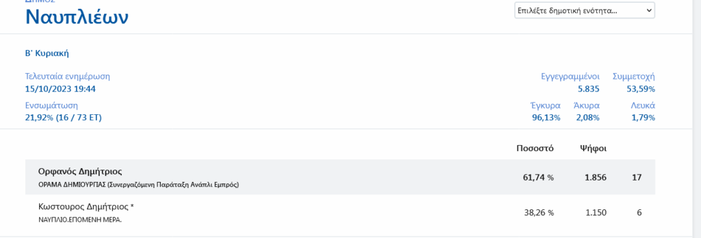 Μεγάλο προβάδισμα Ορφανού στο 22% της ενσωμάτωσης 15/10/202315/10/2023 - by ΕΔΩ ΠΕΛΟΠΟΝΝΗΣΟΣ - Αφήστε ένα σχόλιο Στο δήμο Ναυπλιέων ο κ. Δημήτρης Ορφανός προηγείται με ποσοστό 61,74% έναντι 38,26% που συγκεντρώνει ο κ. Δημήτρης Κωστούρος στο 21,92% της ενσωμάτωσης των εκλογικών τμημάτων