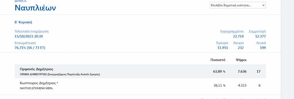Σε ενσωμάτωση άνω του 75% των εκλογικών τμημάτων ο Δημήτρης Ορφανός συγκεντρώνει 63,89% έναντι 36,11% του Δημήτρη Κωστούρου.
